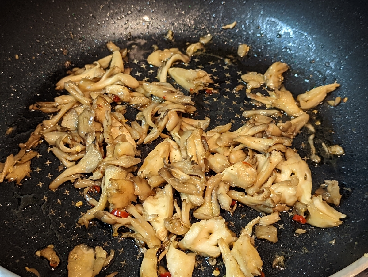 いつも面倒がってオリーブオイルときざみにんにくと唐辛子を一気に入れて熱するんですが、そこに舞茸を手でちぎりながらどんどん入れて、たまに混ぜつつ火を通します (レシピを検索したところきのこは火を通して食べるものらしい)。多分中火とか。味付けはよくわからないので、いつも鶏ガラスープの素を入れて茹で汁で溶かしているのと、今回はよりおいしくな〜れという思いで醤油と酒をなんとなく入れています。