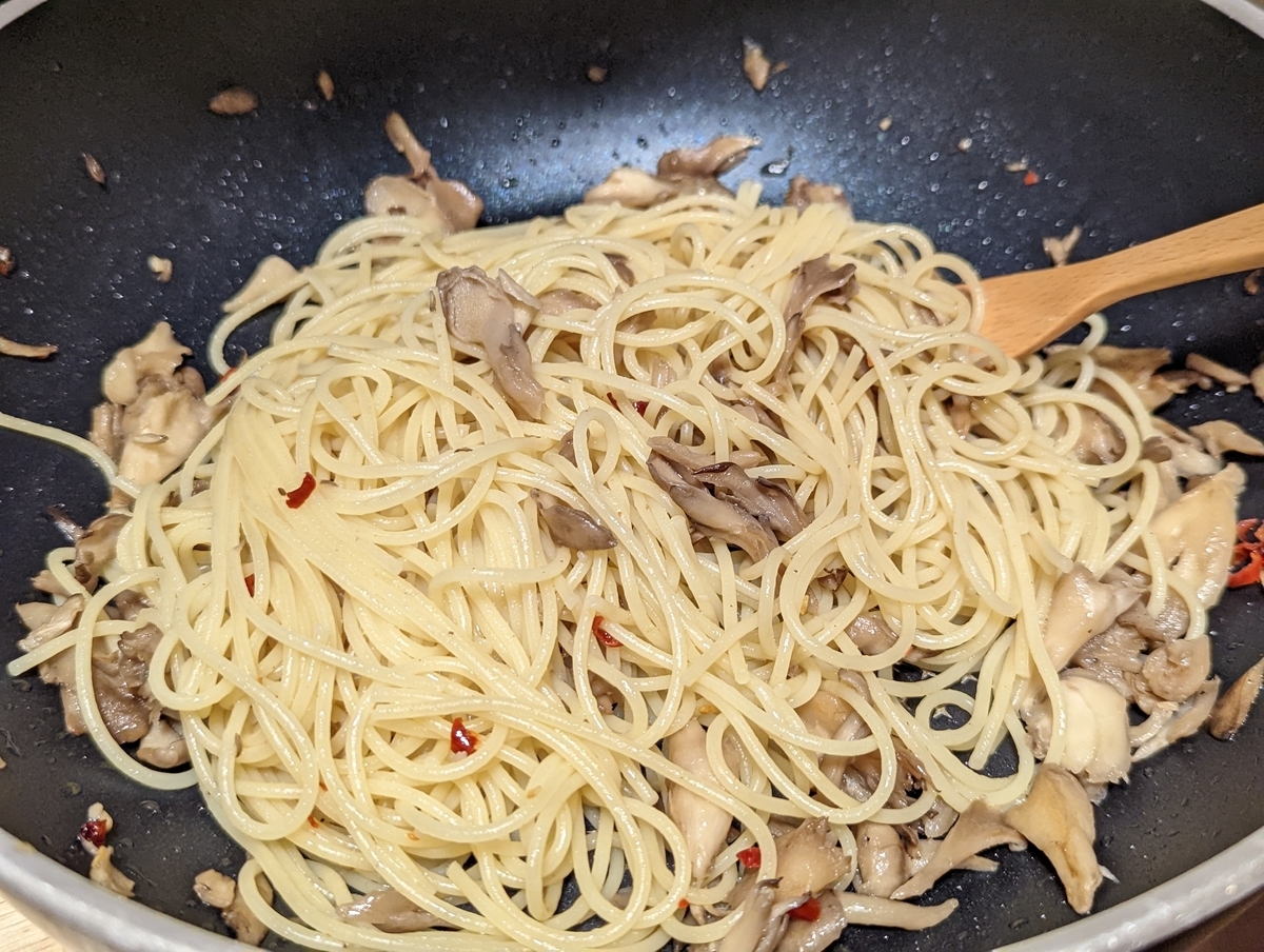 舞茸が好きなので、ペペロンチーノに入れてみました。ペペロンチーノのフルネームはアーリオオーリオペペロンチーノなわけだけど、舞茸を足すとしたらどう足されるんでしょうか (Google 翻訳曰く舞茸は fungo maitake らしい)。