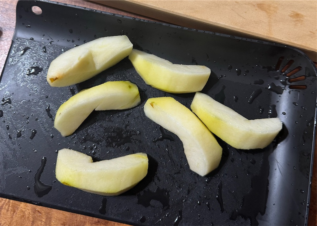 パイシートを常温に戻しつつ梨を六等分に切ります