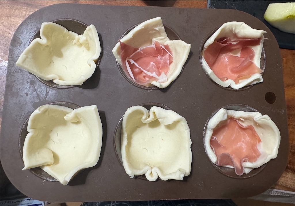 こういう大きいパイって、見栄えはするのですが切るとバラバラになり非常にサーブしづらいという難点があります。そこで、今回はマフィン型を使い、小さいカップ状で作るという試みをやります。