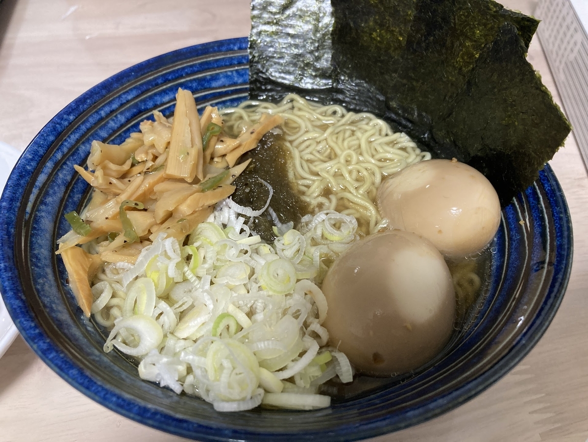 キャンピングカーで北海道を巡る旅をしていた両親が送ってくれた(はずの)北海道のインスタントラーメン(味噌味)に、野菜炒め(ひき肉入り)、味玉、メンマ、コーンを入れて、ネギを乗せて完成。おうちラーメンとしては大変豪華になりました。野菜炒めは多めに作って作り置き大成功!のはずが、美味しくて単品の野菜炒めとして全部食べちゃいました。つくりおき失敗です。